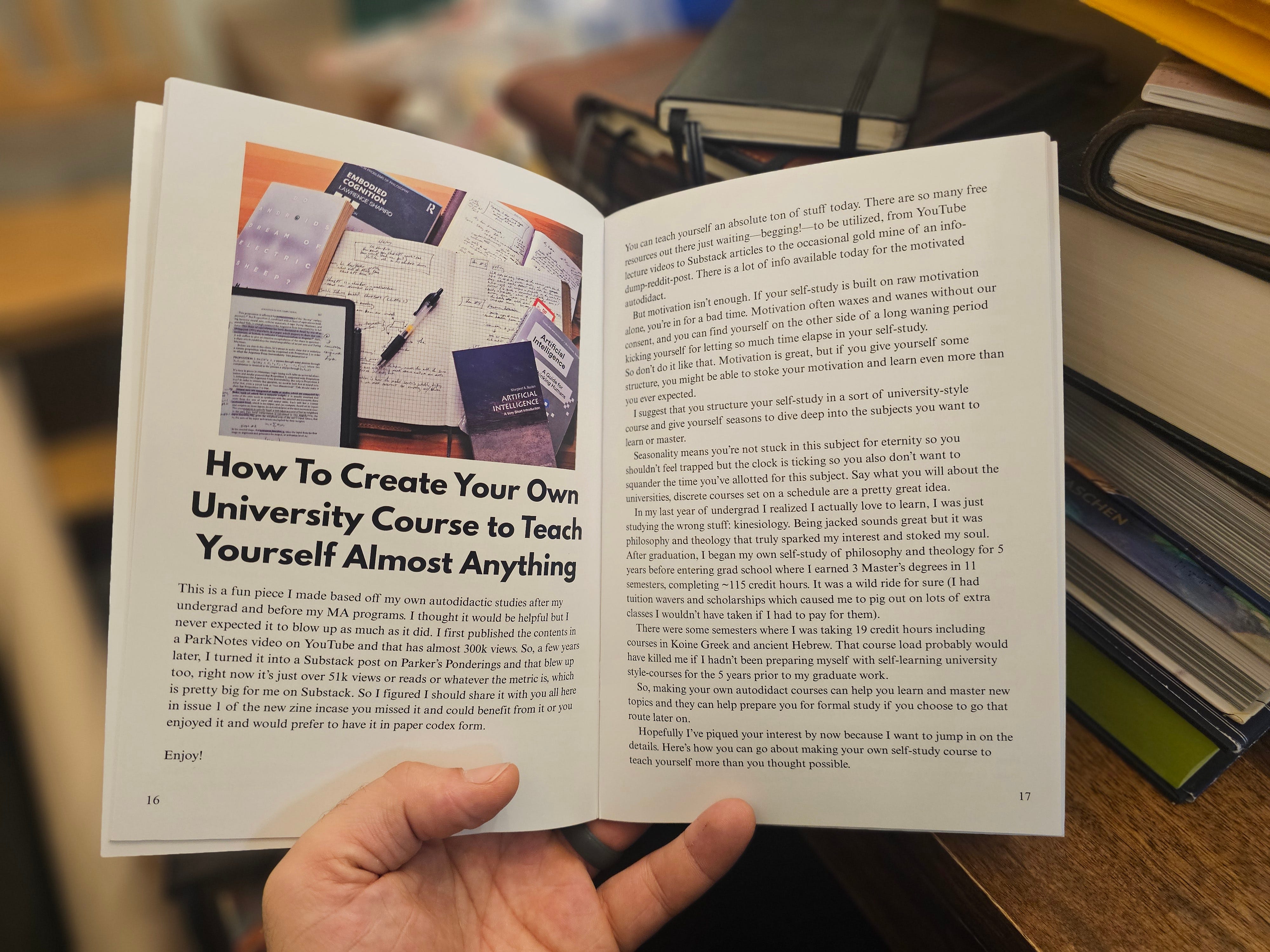 You can teach yourself an absolute ton of stuff today. There are so many free resources out there just waiting—begging!—to be utilized, from YouTube lecture videos to Substack articles to the occasional gold mine of an info-dump-reddit-post. There is a lot of info available today for the motivated autodidact.