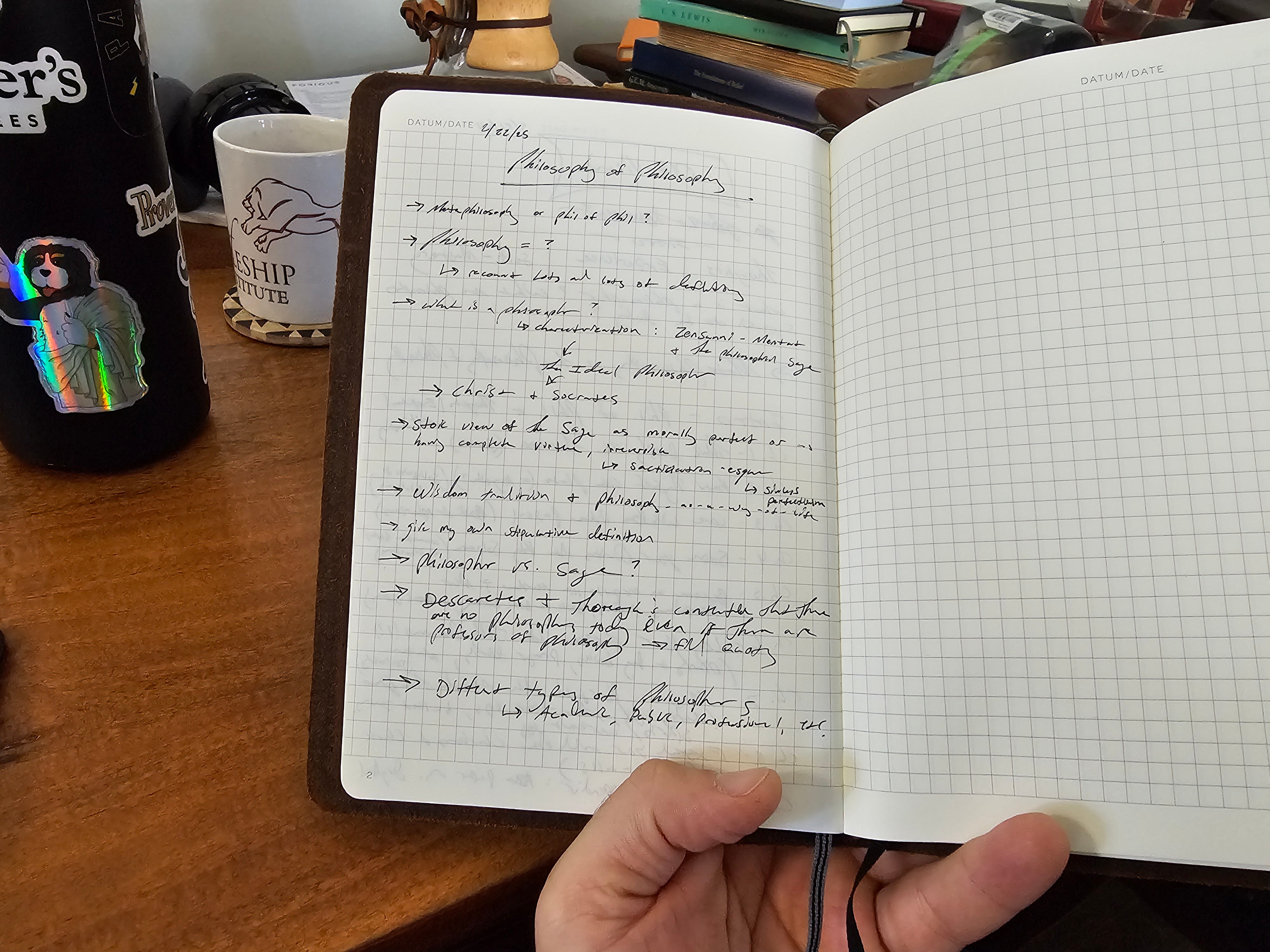 The book seeks to mend the rift between philosophy and the people by plundering the very best of the philosophical academy past and present and teaching it in a deep but accessible way to those who should have had access to it all along. In Journal Like a Philosopher I examine 20+ modes of philosophy, I give some historical background for each mode with examples from philosophers who used those modes throughout history, and then I teach the reader practical habits for applying these modes to their own lives today, using something as simple as a notebook.