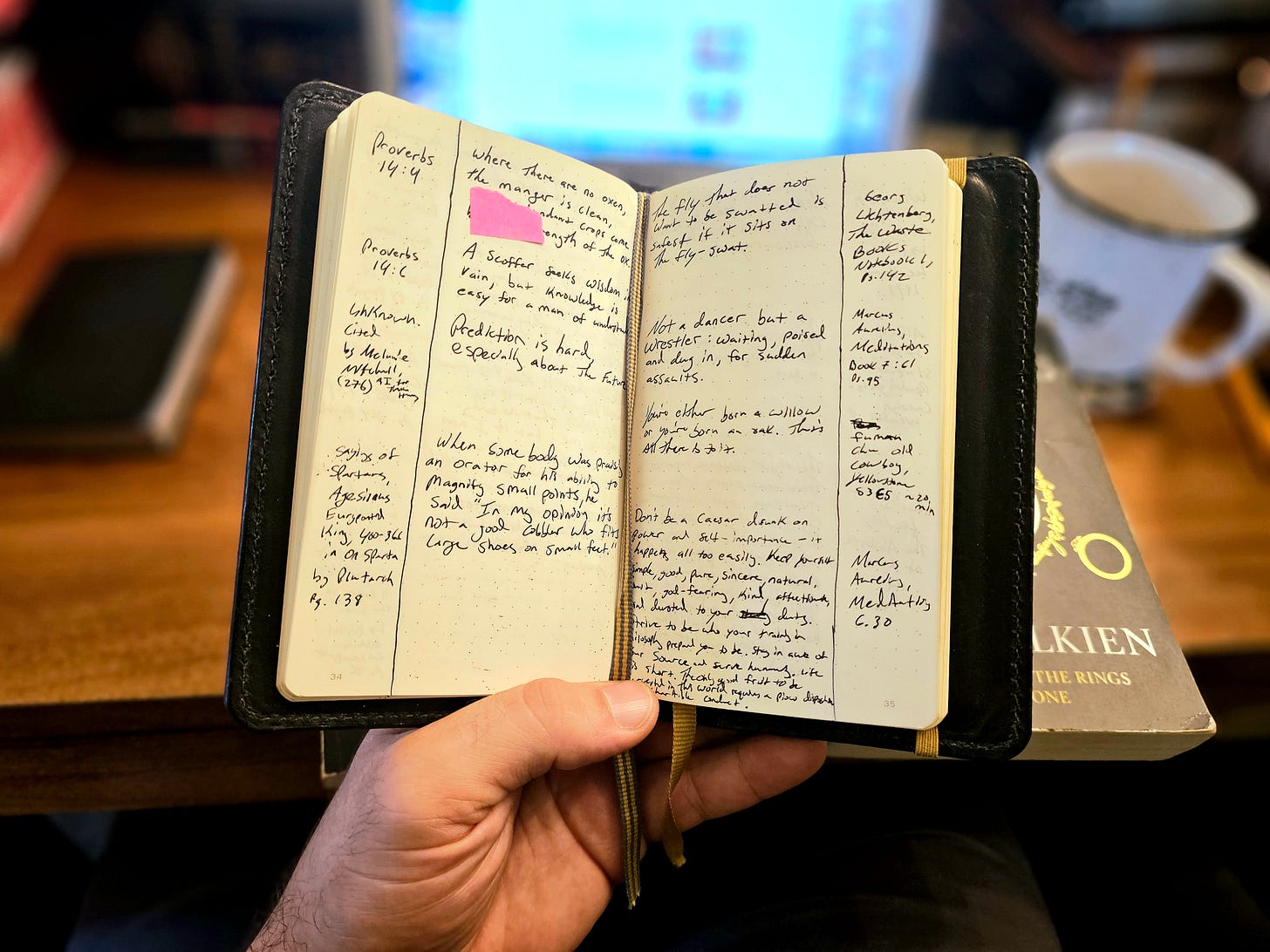 Sayings of the Sages is the digital version of my pocket proverbs treasury commonplace book of wisdom. I keep a golden Leuchtturm1917 A6 pocket notebook in a black Horween leather cover from NormanCahn. I bring it will me just about everywhere I go and when I find a wise saying (sententia), I put it in my treasury commonplace book. It’s a treasury CPB because I don’t add any of my own thoughts like I would in a manuscript CPB—this one is just a storehouse for wise quotes I find—and I find them all over the place. For more on the different kinds of commonplace books, check out this post here: