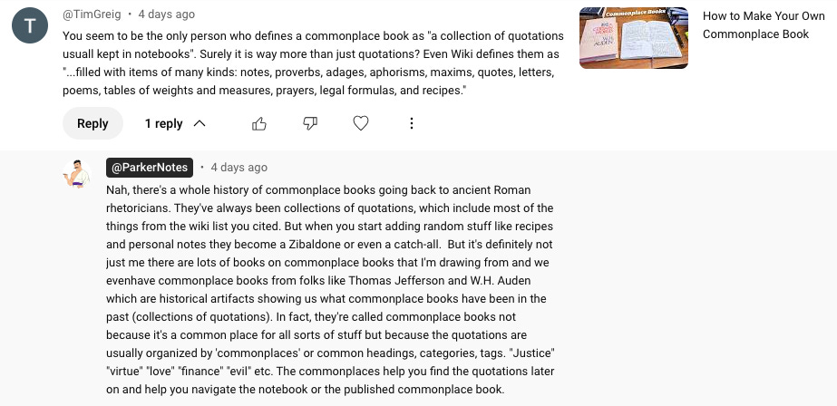 But back to the notebooks. As a notebook czar, I have access to tens of thousands of comments and questions from YouTube users about notebook methods—especially commonplace books. A lot of my commenters think a commonplace book is just a sort of hodgepodge notebook of miscellany. A ‘commonplace’ for all sorts of ideas and recipes and to-do lists, and more.