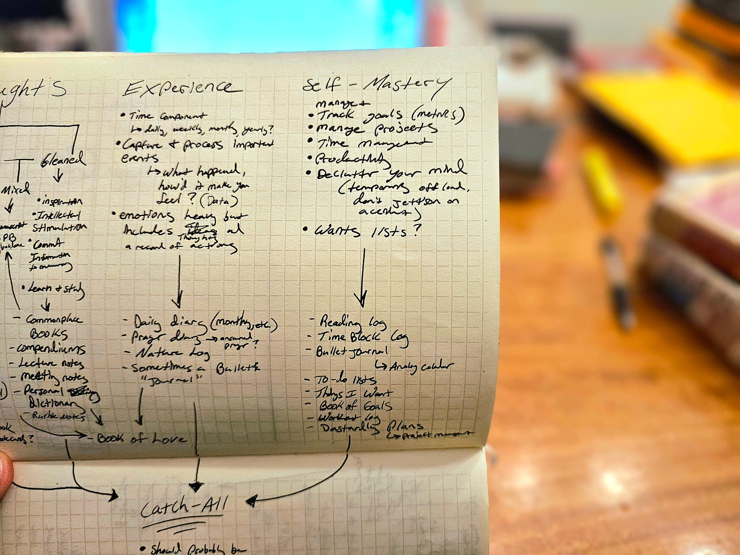 In part 1, I introduced the series and explained that I’ll be cataloging 30+ notebook methods across my three main categories of thoughts, experience, and self-mastery. Then I covered the first half of the Thoughts category: self-generated thoughts. Read that post here: Part 1 - Collecting Your Thoughts